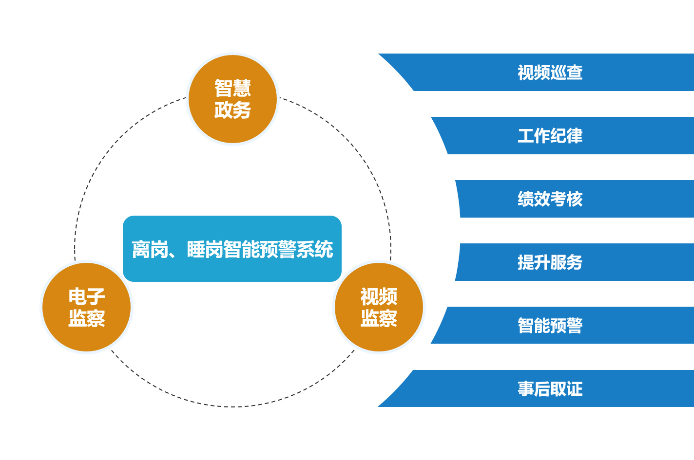 通过使用电子监控设备,当窗口人员离开岗位或者在岗位上睡着时间超过设定的时长,系统会自动报警,并且将其离岗或睡觉时的状况录像保存、留档,并整合进中心绩效考核系统中,达到了高度的自动化管理。有效实现对值班人员离岗、睡岗智能检测的实时预警,包括视频监管、事件预警、信息推送等功能。